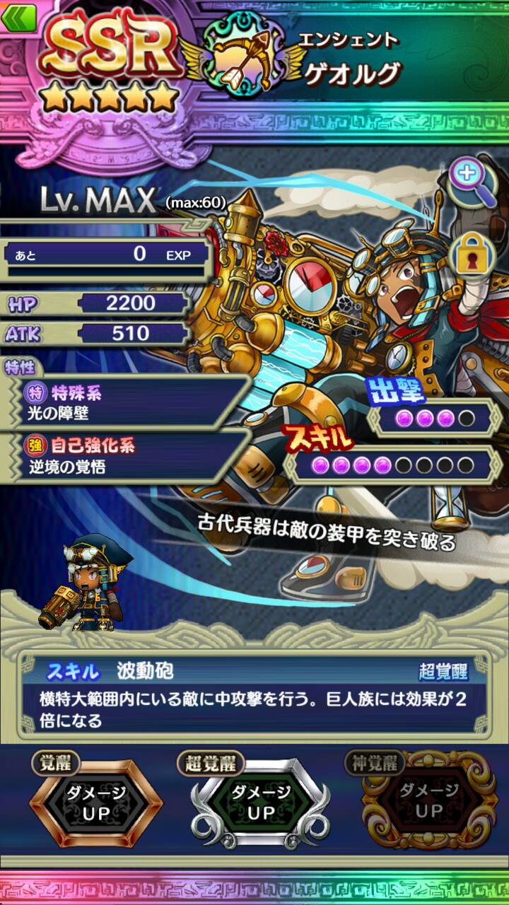 スキルの波動砲は自分を中心に5つ先までの両横方向に中威力(巨人族には2倍)の貫通レーザーを放つ。