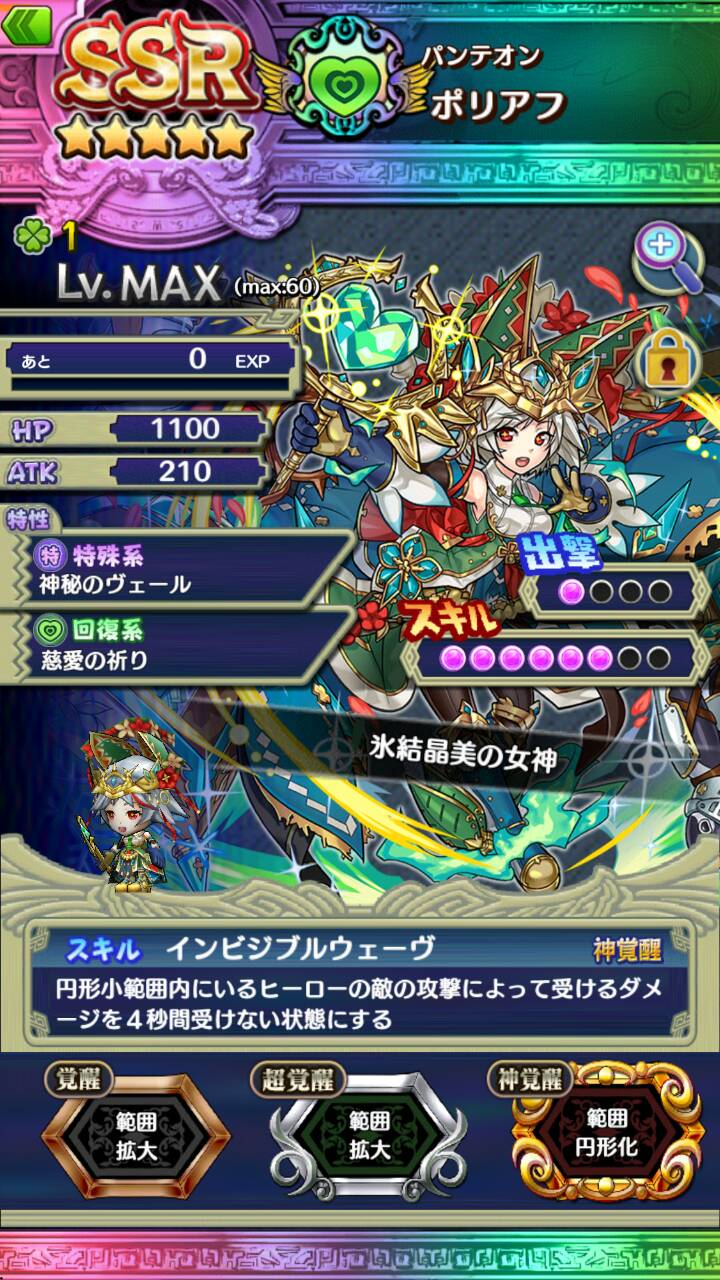 第2特性[慈愛の祈り]でこのヒーローが出撃中の場合、WAVE開始時に自分の全ヒーローのHPを10%回復する。