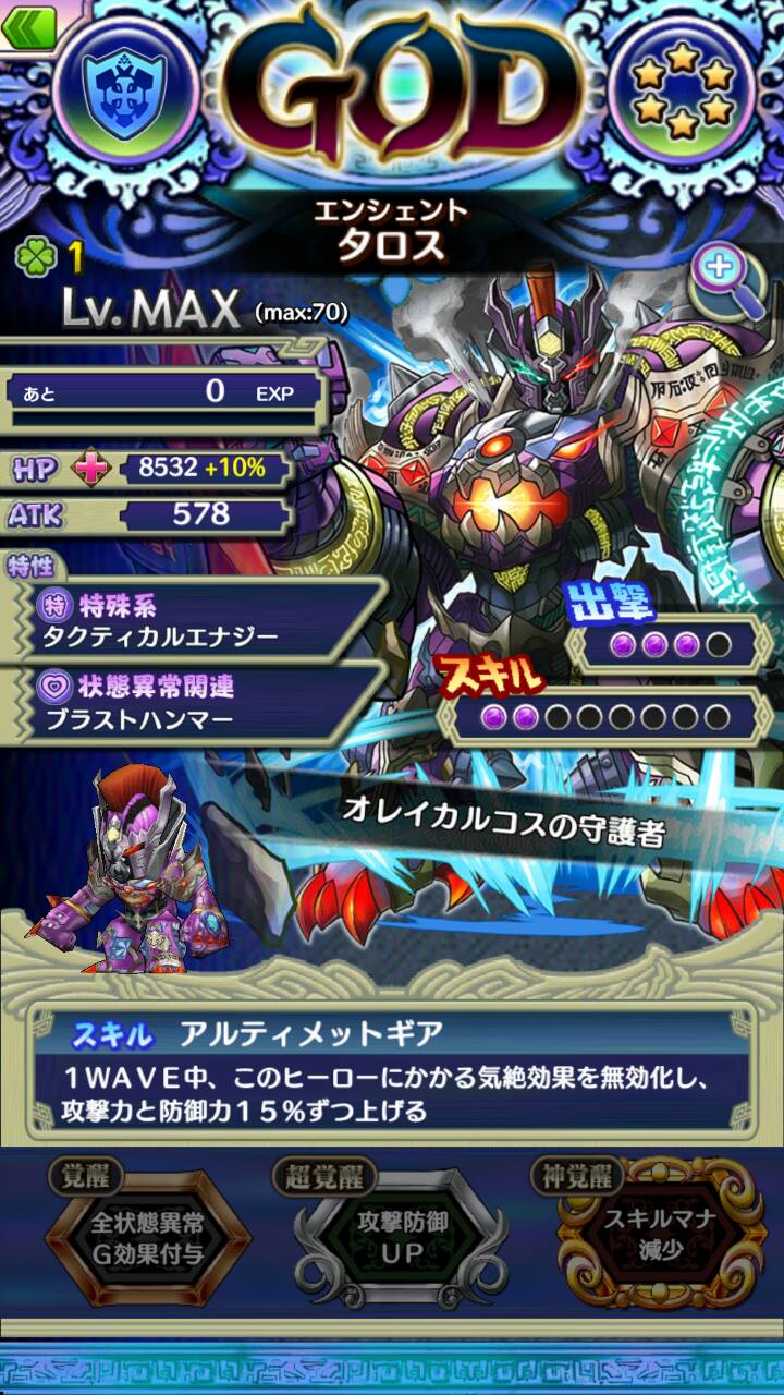 スキル[アルティメットギア]は1WAVE中、自身の気絶を無効化し、攻撃力と防御力を15%ずつ上げる。
