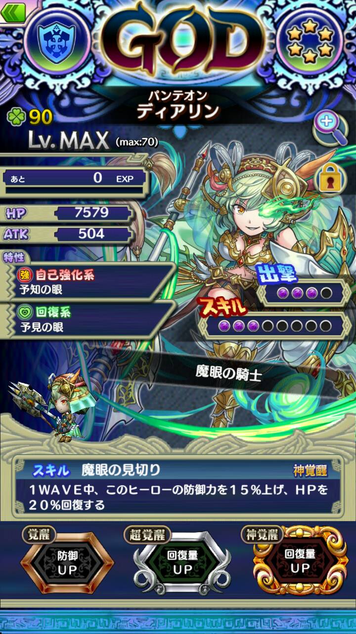 スキル[魔眼の見切り]により、1WAVE中、自身の防御力を15%あげ、HPを20%回復する。