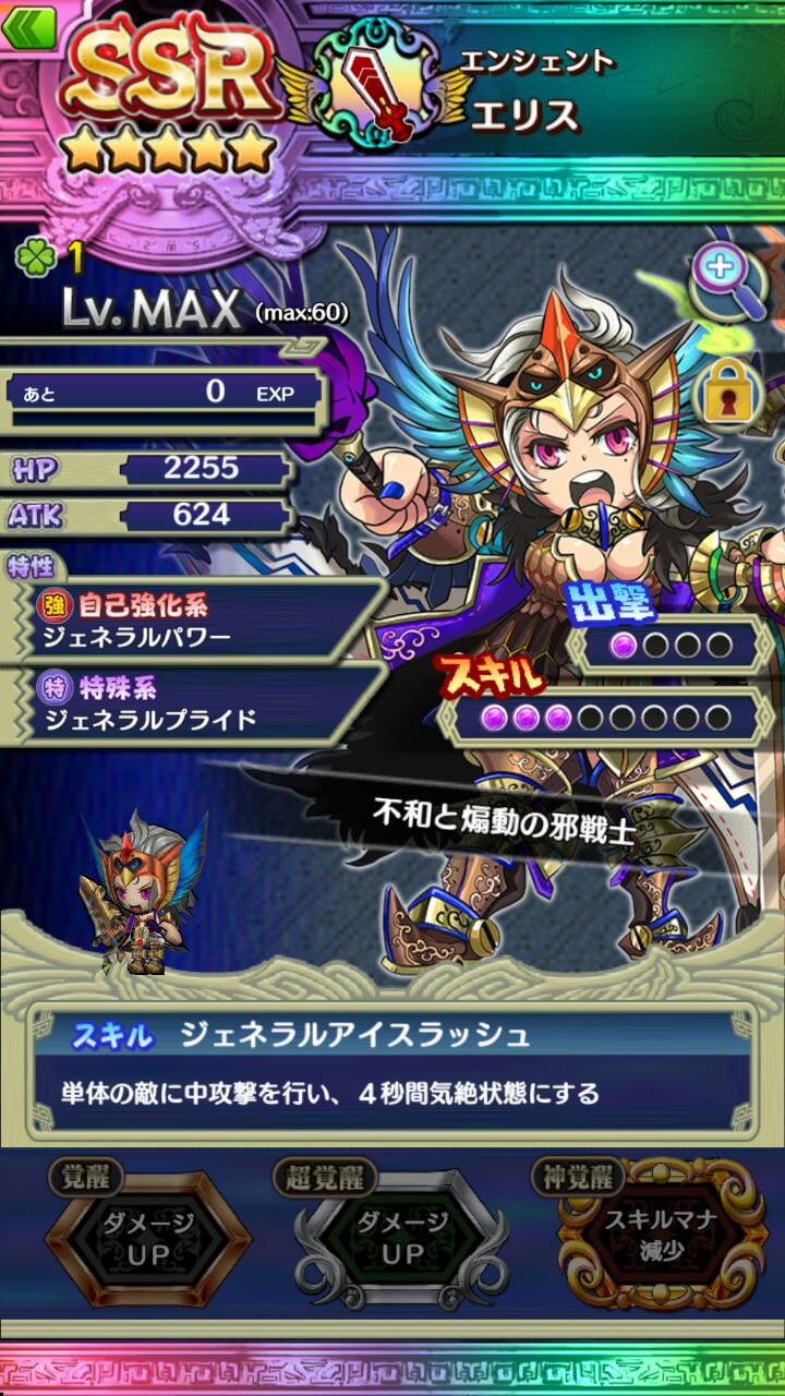 スキル[ジェネラルアイスラッシュ]で、単体の敵に中攻撃を行い、4秒間気絶状態にできる。