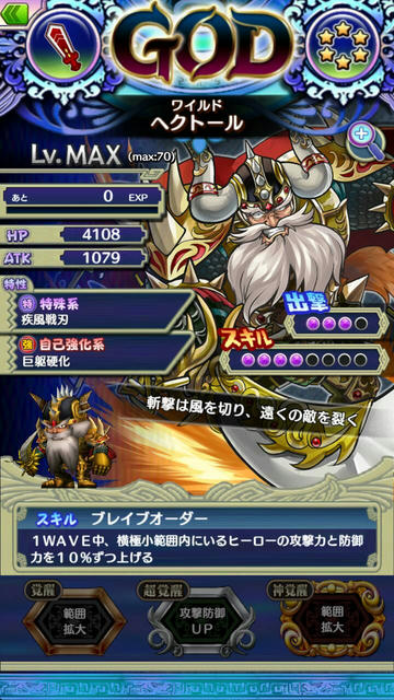 特性[バーサク・フィールド]により攻撃範囲内にいるヒーローの攻撃力を5%上げ、防御力を5%下げる。