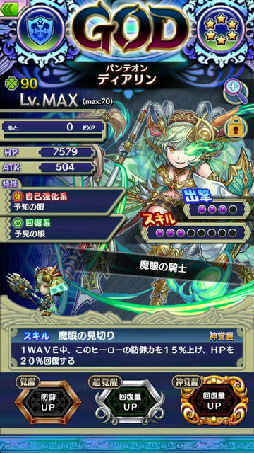 スキル[魔眼の見切り]により、1WAVE中、自身の防御力を15%あげ、HPを20%回復する。